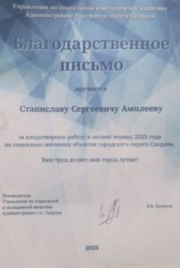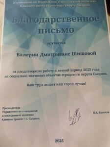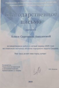 Благодарственными письмами от Управления по социальной и молодежной политике Администрации городского округа Сызрань и подарочными сертификатами для посещения магазина «МЕТИДА» были награждены ученики 8А класса (кл. руководитель Е. С. Шамро) Амплеева Алиса, Амплеев Станислав и Шишова Валерия.