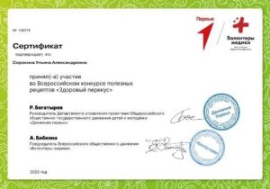 ✅Сорокина Ульяна, обучающаяся 5Б класса (кл. руководитель Кириллова Т.Н.), приняла участие во Всероссийском конкурсе полезных рецептов «Здоровый перекус», за что получила сертификат от руководителя Департамента управления проектами Общероссийского общественно-государственного движения детей и молодежи «Движение первых» Р. Богатырева и председателя Всероссийского общественного движения «Волонтеры медики» А. Бабкина.