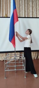 Почетное право поднять флаг выпало ученице 5А класса Новиковой Дарье, которой был вручен похвальный лист за особые успехи в учении по итогам прошлого учебного года.